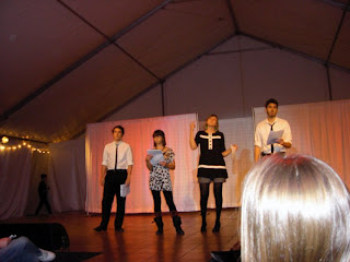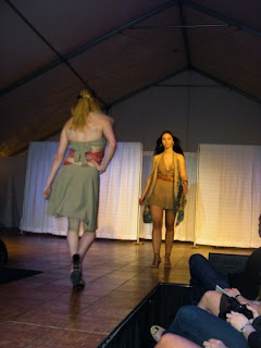 Brittany walking down in my Earth design... tan halter romper and leopard scarf vest by me. Belt, jewelry, and shoes, her own.